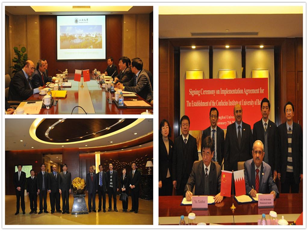 2014年1月7日,巴林王国巴林大学校长易卜拉欣.默罕默德.加纳西博士和副校长沃西博.阿那萨教授一行到访上海大学,上海大学党委书记于信汇、副校长汪敏热情接待了来自巴林的客人。陪同接待的还有校长助理、上海合作组织公共外交研究院院长李伟、国际交流学院院长、孔子学院办公室主任姚喜明、国际事务处处长万旺根、副处长倪兰、国际事务处金祺、苏庆伟、国际交流学院汪剑康、孔子学院办公室黄如祺等。