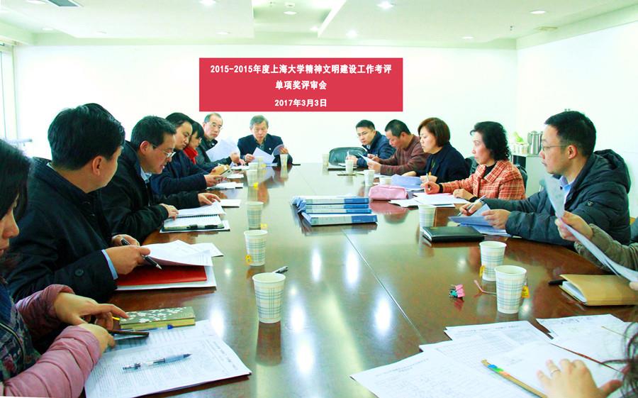 3月3日上午,2015-2016年度上海大学精神文明建设工作考评单项奖评审会在行政楼403会议室举行。校文明办邀请学校相关职能部门领导、有关专家对“文明部门”、“文明窗口”、“最佳结对单位”、“感动上大人物(集体/故事)”和“文明创建特色项目”等奖项进行评审。