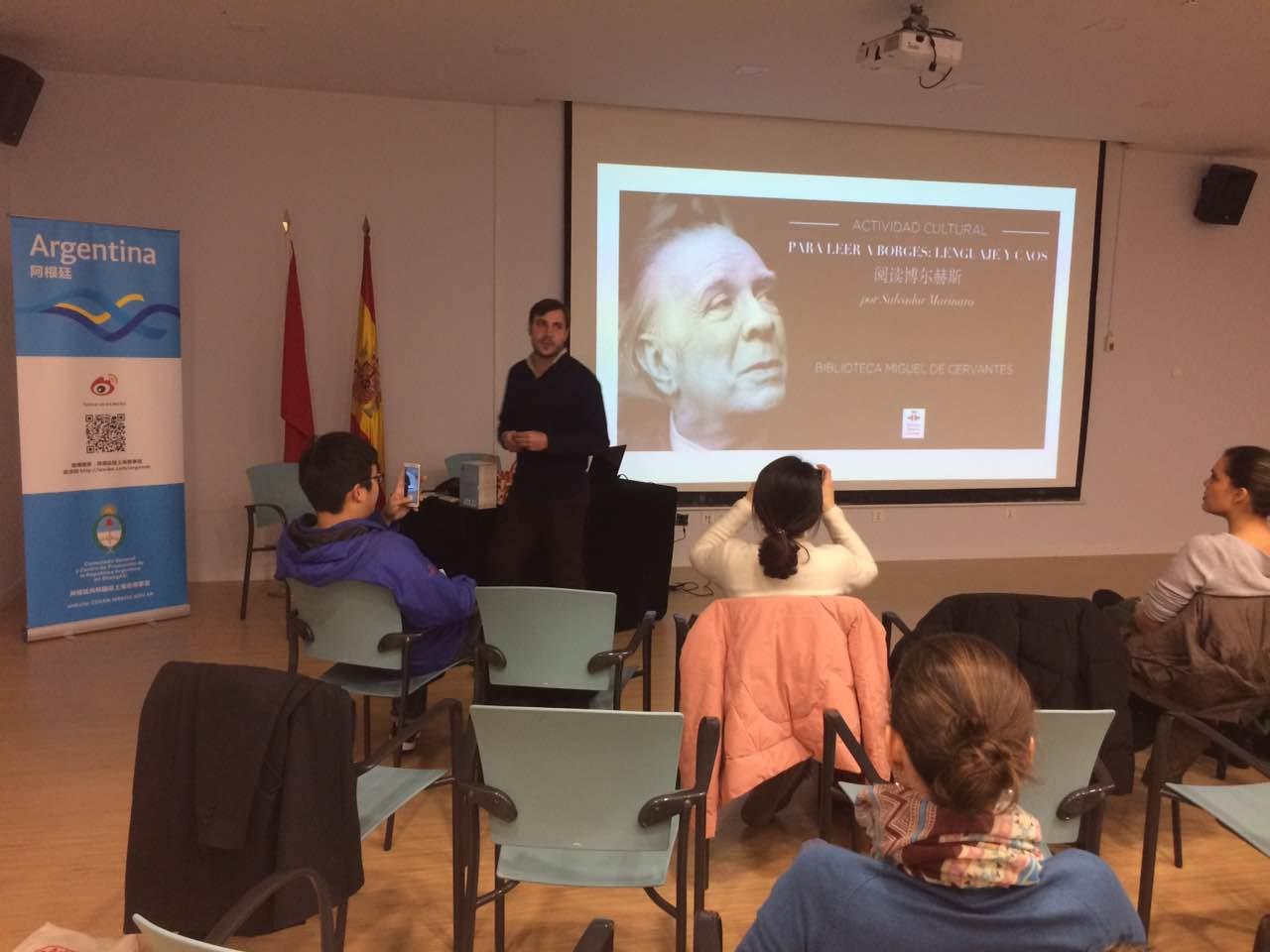 2月17日,上海大学全球学研究中心博士研究生、上海大学-阿根廷国家科技委员会“中阿联合国际研究中心”研究员萨尔瓦多•马利纳洛(Salvador Marinaro),应上海塞万提斯学院的邀请,在该学院举办了题为《博尔赫斯:语言与混沌》(Jorge Luis Borges:Language and Chaos)的专题讲座,阿根廷驻沪总领馆的哈维尔领事(Javier Afredo De Cicco)给现场观众准备了《博尔赫斯全集II》作为抽奖礼物。