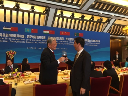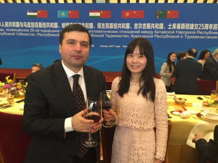 2017年1月10日,为庆祝中华人民共和国与乌兹别克斯坦共和国、哈萨克斯坦共和国、塔吉克斯坦共和国、吉尔吉斯斯坦共和国、土库曼斯坦五国建交25周年,中国人民对外友好协会、外交部与中国中亚友好协会在北京钓鱼台国宾馆联合举办了庆祝招待会。全国政协副主席罗富和、中国人民对外友好协会会长李小林、外交部部长助理李惠来、中国中亚友好协会会长张德广以及中亚五国驻华大使等中外嘉宾共计250人出席招待会。上海大学上海合作组织公共外交研究院李伟院长、助理研究员张真真受邀参加招待会。会上上海大学名誉教授、上海大学上海合作组织公共外交研究院学术委员会主席张德广亲切接见李伟院长。《塔吉克斯坦独立后的政治经济发展》一书的作者张真真在会上受到塔吉克斯坦驻华大使达夫拉特佐达的接见。(张真真供稿)