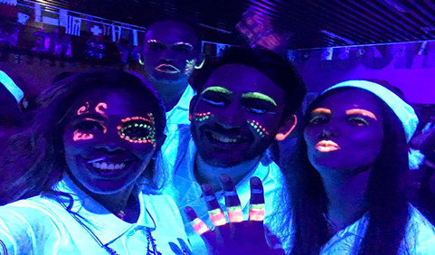 12月22日晚6点半,上海大学中外学生新年派对正式拉开帷幕。国际交流学院副书记、副院长王丽娜老师受邀参加活动,她代表学院向到场的10多位GHA(中外学生交流社团)骨干学生与100多位留学生送上了新年祝福。中外同学们一起玩转派对,参与了乒乓球投篮、气球飞镖盘等许多新奇有趣的游戏。在卡拉OK比赛中来自蒙古的实力唱将阿荣扎雅以一首“没那么简单”惊艳全场,同学们在她的带动下竞相报名参赛,热闹非凡。最后,荧光灯舞会把现场的气氛推向了高潮,在8位化妆师的巧手装扮下每个人的脸上都画着别致的彩绘,在荧光灯下越发显得色彩艳丽,噱头十足。大家随着音乐的节拍舞动起来,青春洋溢的舞蹈让人感受到了同学们的热情与友好,也感受到了他们对来年美好生活的充满了期待。特别值得一提的是,派对活动结束后有许多留学生同学主动留下来帮忙打扫场地、回收游戏道具,做到了有始有终,展现出他们负责任、有担当的另一面。