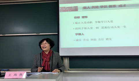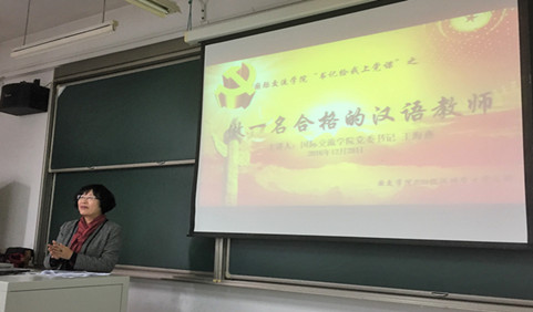12月28日下午,国际交流学院“书记给我上党课”系列活动之“做一名合格的汉语教师”专题课程在上海大学宝山校区D220举行,国际交流学院党委书记王海燕老师为2016级汉语国际教育硕士班32名中国籍同学和4名外国留学生同学上了一堂别开生面的党课。
