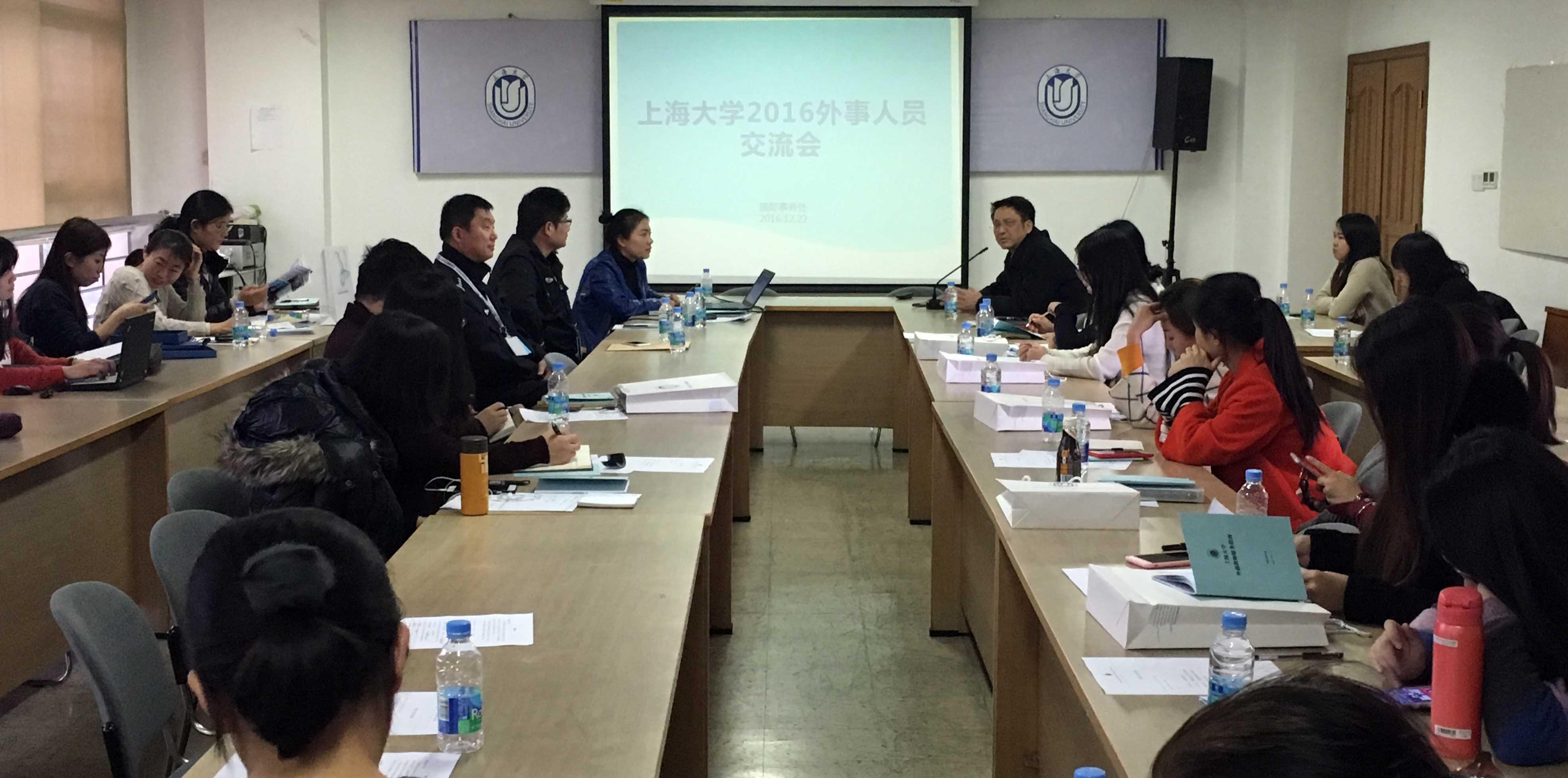 2016年9月,国家外国专家局下发了“关于印发外国人来华工作许可制度试点实施方案的通知”(外专发〔2016〕151号),将“外国人入境就业许可”和“外国专家来华工作许可”整合为“外国人来华工作许可”(以下简称“两证整合”),于2016年10月至2017年3月在上海等10个试点地区开展外国人来华工作许可制度试点工作。为贯彻落实国家外国专家局推进“两证整合”的工作精神,方便学校各学院/部门的外事工作人员了解相关新政,12月22日下午,国际事务处组织召开了“上海大学2016外事工作人员交流会”,国际事务处万旺根处长、上海市出入境管理局王韬警官、王波警官以及来自28个学院/部门的外事秘书参加了本次会议。
