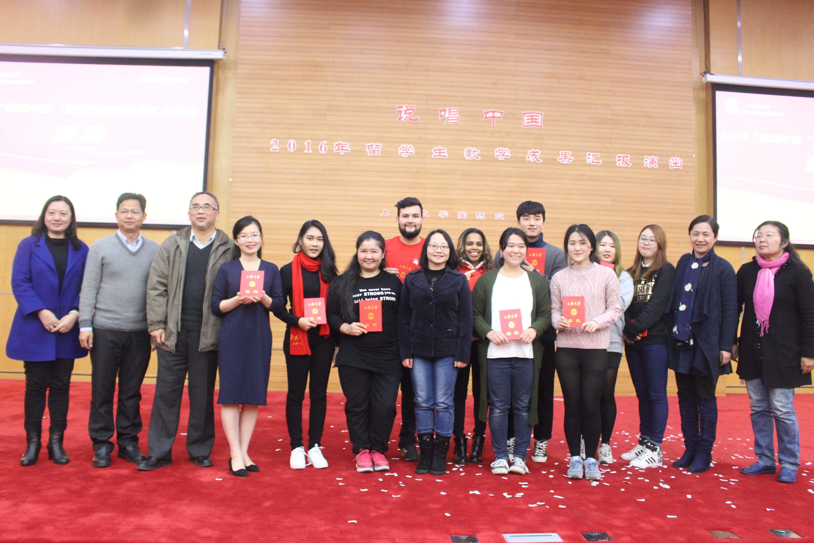 12月16日下午,上海大学国际交流学院“说唱中国”—2016留学生教学成果汇报演出在图书馆报告厅拉开帷幕。上海大学教育质量考察与评估办主任辛明军、研工部副部长凌长臣、文明办副主任孙蕊、语言文字委员会办公室主任徐骅以及国际交流学院副教授常峻担任此次活动的评委。上海大学国际交流学院院长姚喜明、副院长杨静出席活动。