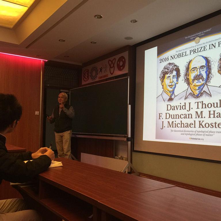 上海大学定量生命科学国际研究中心特聘教授敖平老师为同学们带来了一场精彩的量子拓扑科普讲座,他讲述了自己跟随导师诺贝尔物理学奖得主Thouless教授的研究经历,并鼓励同学们要敢于自我挑战,开辟新的研究领域。