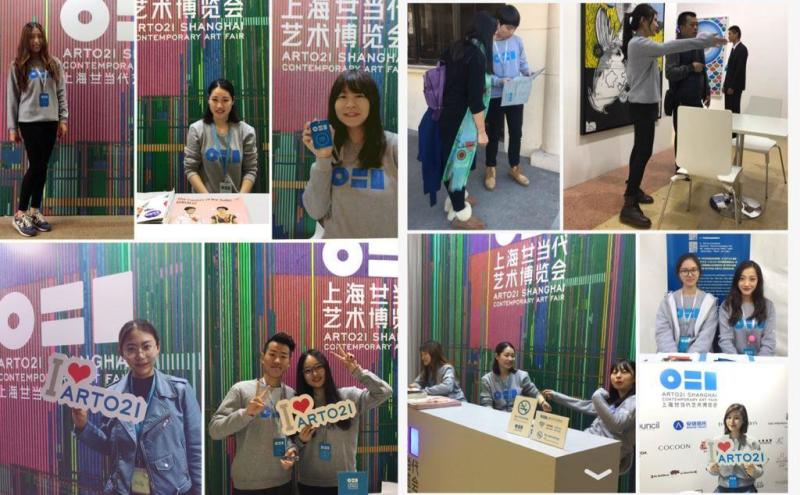 参加活动的志愿者在接受了关于志愿者服务理念、ART021介绍、岗位基本情况、工作内容、活动流程、博览会现场相关内容的岗前培训后,于11月9日起便开始参与博览会开幕前期准备,包括参展商接待工作、活动场地布置、物料接收及确认等。接下来从11月10日、11日的尊贵藏家预览到12日、13日公众开放日,近20名志愿者不辞辛劳的往返嘉定校区和上海展览馆之间,积极投入志愿服务工作,为博览会提供展览咨询、艺术家及明星接待、动线引导、活动现场秩序维护、票务中心相关、物料分配等服务。服务过程中,志愿者们身穿统一服装,忙碌而有序的身影点缀在众多精妙绝伦的当代艺术作品中,成为博览会上一道独特的风景线。
