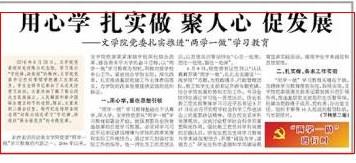 “两学一做”学习教育基础在于认真学、深入学。文学院党委从“两学一做”学习教育部署会开始,就强调要在全院营造浓厚的自觉学习氛围,必须将学习习近平总书记讲话精神与学院的改革发展和实际工作相结合,通过学习加强对实际工作的指导,统一师生员工的思想认识,以思想共识带动师生“心往一处想,劲往一处使,智往一处谋”。