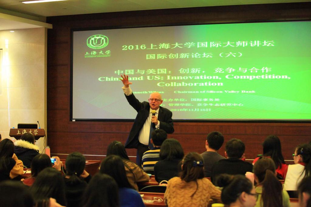 Kenneth Wilcox先生曾担任硅谷银行金融集团总裁兼首席执行官。任职期间,他启动了企业的战略拓展与多元化,同时始终专注于公司各项核心行业。基于多年来在中国和美国丰富的创新实践和深刻的洞察,作为创新投资领域最成功的银行家,他结合他在中国这几年的经历和切身感受,与上海大学的师生们分享了他对中美创新的思考,以及未来两国在创新上的竞争与合作。他形象地将不同国家之间文化的差异类比成年轻夫妻之间的矛盾,个体与个体之间是有差异的,只有通过体会不同文化背景下的思想,才能增进融合、减少摩擦,这点在全球化的时代是非常重要的。