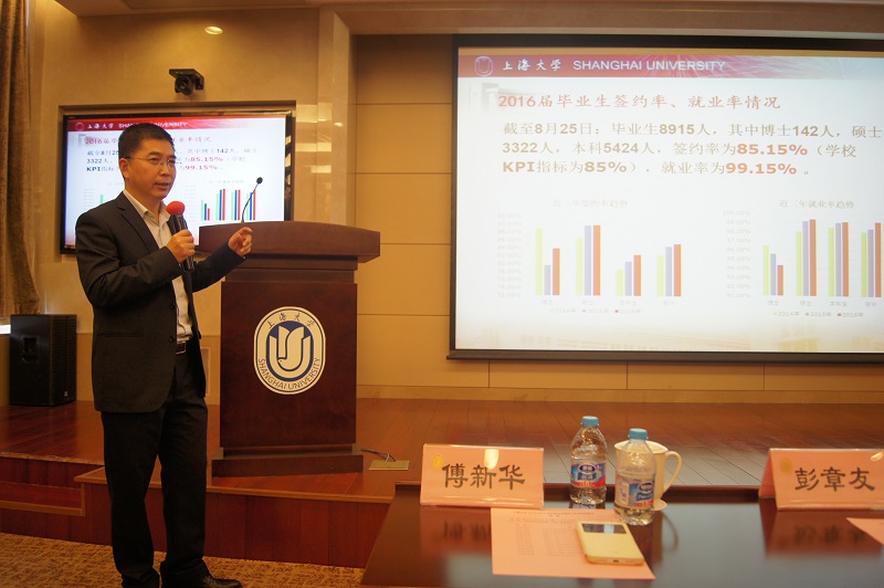 招毕办副主任傅新华首先回顾了2016年就业工作情况。他指出,就业工作关系到国家经济建设和社会稳定,关系到学校长远发展。经济新常态背景下,就业结构性问题突出,我校2016年就业工作在全校师生的共同努力下, 就业率、签约率、生均就业质量、签约世界500强人数等方面均显著提升。接着,他着重介绍了今年学校申报创新创业50强高校、“互联网+”精准就业服务、以“家国情怀”融合职业选择等工作举措。傅新华表示今后就业工作方向将紧密围绕国家、地方重大战略需求以及学校办学定位,加强工作创新,突出内涵建设,促进上大学子高层次、高质量就业。