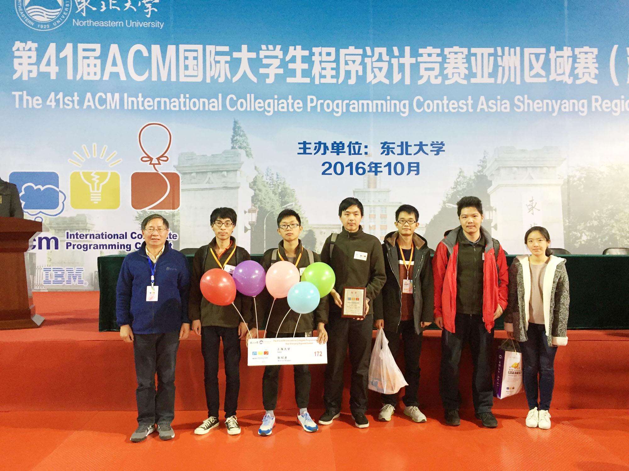 2016第41届ACM国际大学生程序设计竞赛(ACM-ICPC)亚洲区域赛中国大陆第二场比赛于2016年10月22日在沈阳东北大学拉开帷幕,来自115所高校的186支队伍了参加比赛,另有10支队伍友情参加本次比赛。我校派出了计算机学院由13级学生高樱宁、许燚和16级研究生陈亮波组成的制杖队(Wander)和14级学生张自强、潘文韬、周佳乐(女)组成的魔蛙队(Magic Frog)队参赛,由沈云付老师担任教练。