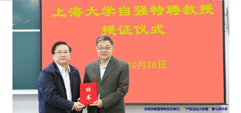 2016年10月26日上午,“上海大学自强特聘教授授证仪式”在上海大学本部校区DJ304成功举行。校党委副书记、纪委书记夏小和教授向中国社会科学院法学研究所民法室主任、著名法学家、中国民法研究会常务副会长、十二届全国人大代表孙宪忠教授颁发了“上海大学自强特聘教授”证书,并且发表讲话,夏小和教授先对孙宪忠教授的到来表示感谢,随后他讲到,法学是一门很古老的学科,对社会的发展起到了巨大的作用,学校对法学院的工作很重视,对法学院的发展给予厚望。法学院党委书记吴仲钢、主持工作副院长李凤章教授、张秀全教授、李智教授、杨显滨博士等老师出席了受聘仪式。