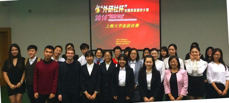 10月19日晚,2016年“外研社杯”全国大学生英语演讲大赛上海大学选拔赛决赛在J101顺利举行。上海大学教务处副处长尹应凯、外国语学院党委副书记曾桂娥及全校120余名师生一同出席比赛现场。本次决赛评委由外国语学院竞赛指导委员会朱巧莲、曾桂娥、陈秀猛、龚萍、邵庆华五位老师和悉尼工商学院外教Benjamin Allen共同组成,来自外国语学院、社区学院、机自学院、理学院、上海电影学院、管理学院等六个学院15名同学展开角逐。