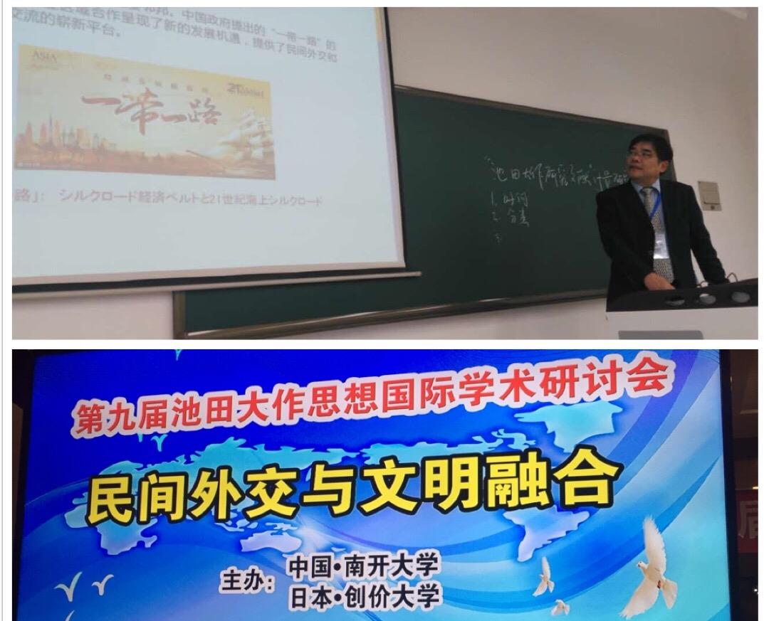 由南开大学和日本创价大学共同举办的“民间外交与文明融合—第九届池田大作思想国际学术研讨会”10月22-23日在南开大学举行。上海大学东亚研究中心主任、外国语学院马利中教授应邀与会并发表了“一带一路是推动东亚区域合作和民间外交的平台——兼论池田大作和平文化思想”(马利中、叶蓉撰写)的学术论文。马教授在论文中指出,池田先生长期致力于增进中日两国人民的交流与合作、致力于人类的文明对话和生命尊严与价值的实现。在他的思想中,对于多元文化和文明融合、对于推动民间外交有着相当深刻而独到的真知灼见。中日韩三国互为重要邻邦,中国政府提出的共建丝绸之路经济带和21世纪海上丝绸之路的“一带一路”倡议为东亚区域合作呈现了新的发展机遇,提供了民间外交和文化交流的崭新平台。博大渊深的池田和平文化思想可以为我们研究“一带一路”的民间外交和文明融合作用提供具有积极指导意义的思想启迪。池田先生“文化是波,政治是船,经济是载荷物”的比喻,形象地说明了他借助文化文明的力量推动世界政治经济发展的大思路和大视野。