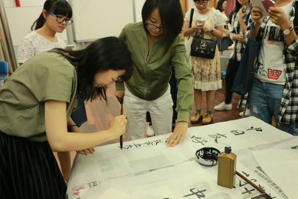 随后是书法社带来的表演。伴随悠扬的笛声,两位成员现场挥毫,“秦晋之好”表达了我们希望两国关系友好的愿望。书法展示成功吸引了现场观众的注意,得到允许之后写字桌旁立刻围满了观赏的同学和老师。表演完毕日本代表团也踊跃参与,大阪市立大学青桃会书法团还应邀写下了“中日友好”的中国汉字,尽显深刻友谊。