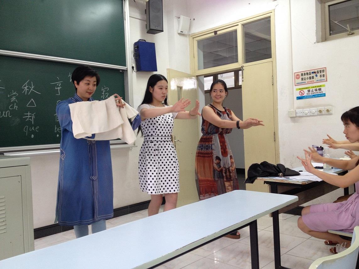 这一期京剧课的三位老师,皆是名门高徒,她们冒着酷暑,穿越大半个上海,来到文学院的讲台上,莫不和蔼可亲、循循善诱,让大家分外感动。她们一遍又一遍地教唱同一段唱段,不放过哪怕一个小腔的错漏,还用分组演唱的方法检验同学们的学习成果。