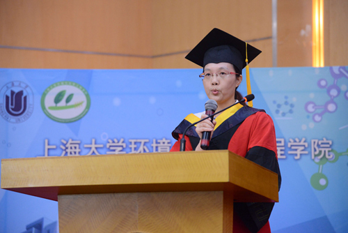 随后,学院80级校友、上海宝钢金属有限公司副总经理卢四平先生做主题演讲,他从自身工作经历出发,结合环保事业的发展现状,对毕业生们提出几点建议:要不断追求梦想并坚持梦想、要不断学习不断进步、要学会包容学会感恩,并号召大家毕业后常回母校看看。学院党委书记钱冬英老师也随即为毕业生们送上了寄语:希望大家在走上社会后脚踏实地、自信从容、做最好的自己,心怀感恩、做最好的家人,铭记校训精神、抓住环保事业的机遇、做最好的社会人,心系母校、奉献社会、做最好的上大环化人。