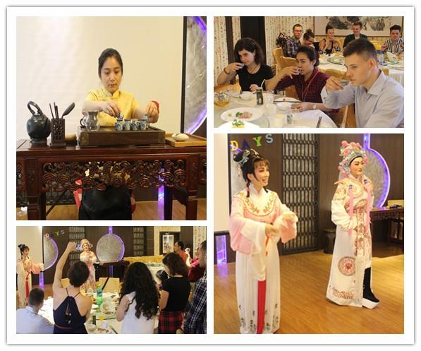 2016年7月1日上午,结业典礼结束以后,国交学院党委副书记、副院长王丽娜老师和孔子学院办公室副主任金祺老师在宋园茶艺馆为即将离校的孔子学院奖学金生举办了一场别开生面的欢送会。盛夏的上海酷热难耐,但古香古色的宋园茶艺馆给师生们带来了丝丝凉爽,这凉爽立刻让每个人都平静下来。坐定以后,服务员送上了清香解暑的铁观音茶,品茶的同时,朱焱炜老师为大家讲解中国茶文化。同学们喝得香,听得更是入神。茶文化讲演结束后,宋园茶艺馆的茶艺师又为同学们送上一段精彩的茶艺表演,一举手一投足别有韵味,诠释着中华五千年悠久的文化。随后,两位专业的越剧演员为奖学金生送上了一段越剧表演《山河恋》。留学生听得如痴如醉,仿佛也跟着穿越回了古代,回到了那个没有现代喧嚣的时代,一切那么轻松惬意。欢送会自然少不了惜别,小伙伴们各个恋恋不舍,舍不得曾经一起读书的小伙伴,舍不得刚刚熟悉的上海,舍不得每日漫步的青青校园,舍不得…..,舍不得实在太多,数也数不尽;小伙伴们相约,几年以后再回中国,回到上大,看看当年的小伙伴,看看当年的他(她)…..