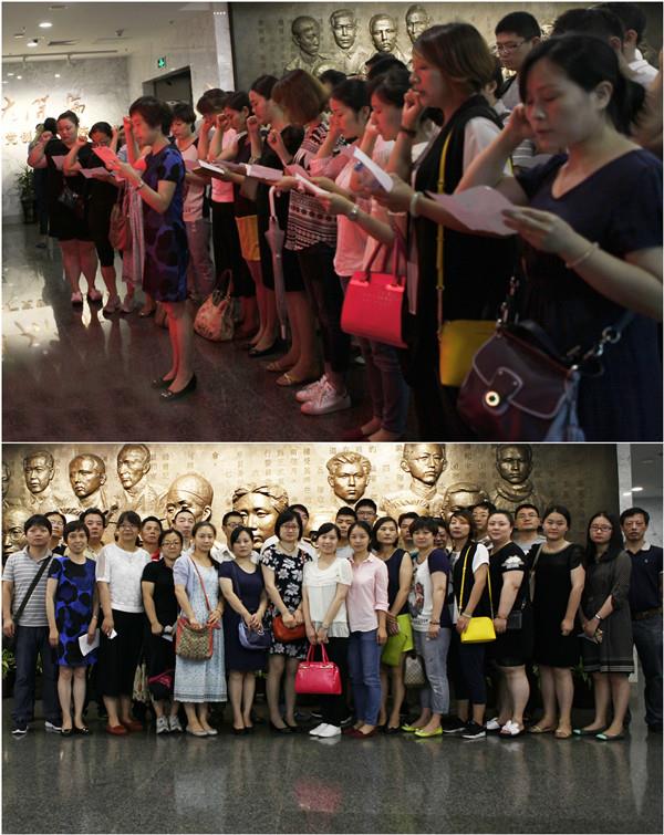 教职工新党员到一大会址宣誓是我校的优良传统,二十多年来,每年七一党委组织部都会专门安排这项活动。正如组织员汤智佩说:“这是一次很神圣的仪式教育,尽管形式很简朴,但身临其境的感觉是任何其他形式、环境所代替不了的。”七一宣誓激励着一代代的教职工党员不忘初心,不断前进。