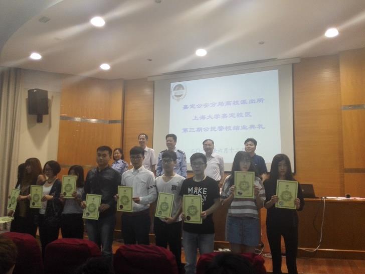 典礼首先以短片形式回顾了自4月20日开班以来公民警校的历次活动。随后保卫处朱佳贤老师作为公民警校校内班主任发言,鼓励学员们在今后的学习生活中运用此次培训所得,保护好自身生命财产安全的同时也带动身边的同学一同提高警惕。两位学员代表从自身经历出发,谈了参加公民警校培训对他们的帮助和影响。嘉定公安分局高校派出所副所长赵勤梅表示将加强与我校合作,继续开办公民警校的培训活动,希望能让更多的上大学生受益;上海大学保卫处副处长何金伟希望公民警校毕业生们能积极投身校园安全管理工作,深入到学生群体中,更好地发挥宣传作用;上海大学继续教育学院副院长王惠珏感谢高校派出所和保卫处为继续教育学院的学生组织了那么有意义的培训活动,并表示这样的培训活动将使学员们受益终身,希望以后能继续开办这样的培训活动。最后领导们为66位学员颁发了公民警校结业证。