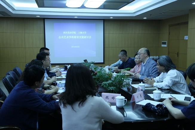 5月26日下午,四川美术学院党委副书记左益、公共艺术学院副院长郭晏驎一行7人赴上海大学美术学院调研交流。上海大学党委副书记、副校长徐旭,上海大学美术学院院长汪大伟、美术学院副院长陈青、公共实验艺术技术教学中心黄建平、设计系主任董卫星、建筑系主任刘勇及学院综合办主任宋国栓等相关工作人员与来宾在宝山校区行政楼803会议室召开了“公共艺术学科建设交流研讨会”。