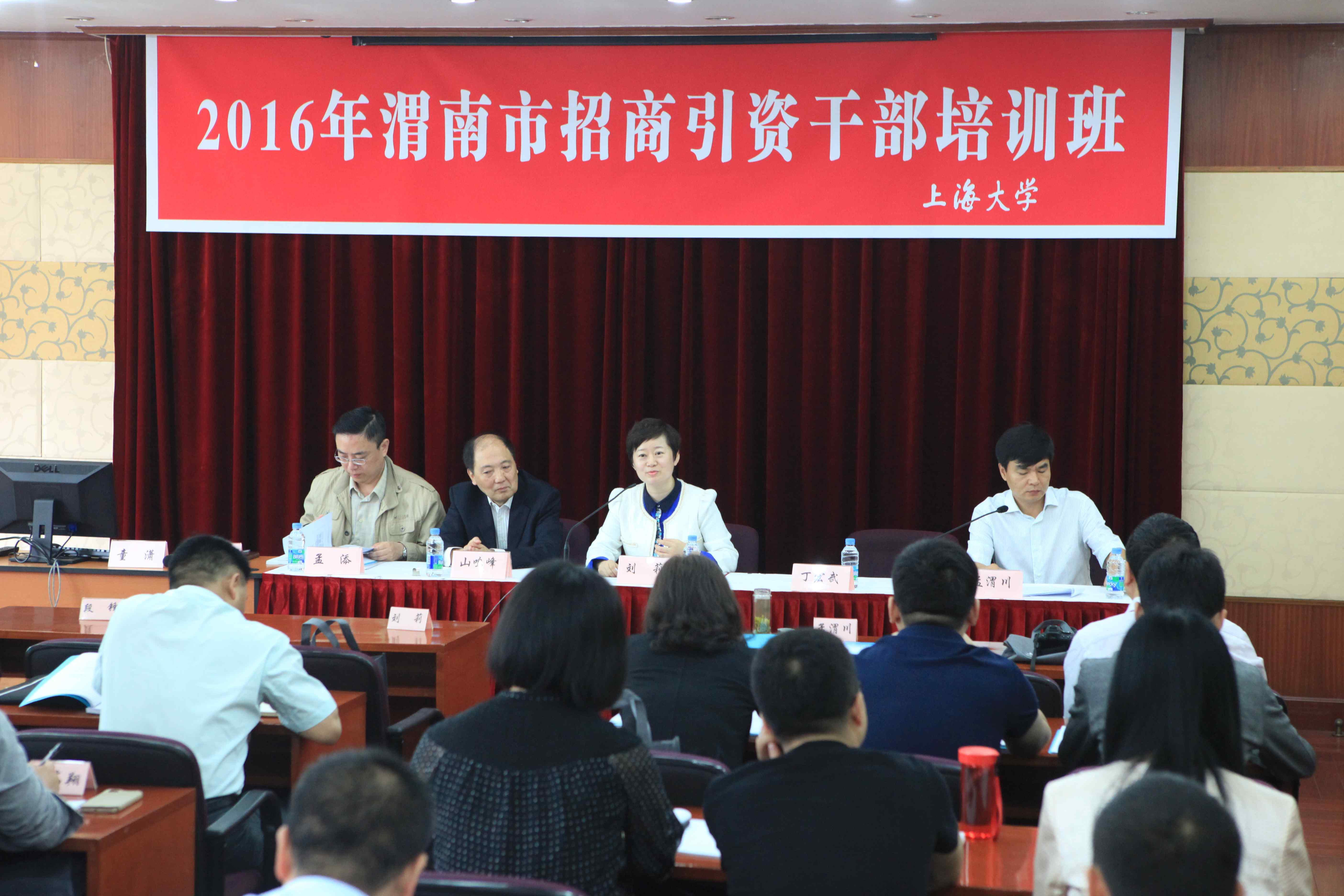 2016年5月24日上午8:30,陕西省渭南市招商引资干部培训班在上海大学延长校区科技楼817室举行。渭南市对外经济技术合作局副局长孟渭川主持开班仪式,渭南市对外经济技术合作局局长刘莉、渭南市驻沪办主任丁宏武、上海经济管理中心主任山鸣峰、副主任孟添等领导出席开班仪式。