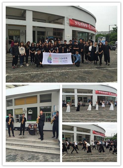 中午11点40分,伴随着下课铃响,快闪活动正式开始。首先,由汪晨曦同学带来的架子鼓solo为这场演出揭开了帷幕,富有节奏感的律动顿时吸引了不少师生驻足欣赏;这边鼓声刚落,由刘佳辉、杨笑谈、沈思南、王梓四位同学带来的萨克斯表演《我心永恒》迅速登场,绵绵细雨伴着悠扬旋律,仿佛将大家带回了曾经的电影情节,真是妙不可言;紧接着弦乐团的同学们紧随其后,她们一袭白裙,为现场观众演绎了一曲《加勒比海盗》,同学们精湛的琴艺赢得了现场阵阵掌声;器乐节目刚刚结束,伴随着动感的节奏,人群中闪出一群曼妙的身影,原来这是舞蹈团的同学们,他们带来的是舞蹈《乌云珊丹》,带有民族特色的舞姿引得现场欢呼连连,他们热情奔放、整齐划一的动作征服了现场的每一位观众;既有传统民族的当然少不了现代潮流的节目,由杨若男等同学带来的舞蹈《Good Boy》、《Sorry Sorry》使大家体味到了青春的激情与魅力,观众们对演员们报以热烈的掌声。