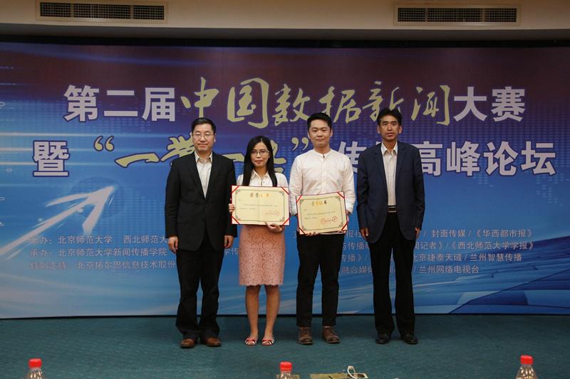2016年5月7日,第二届中国数据新闻大赛暨“一带一路”传媒高峰论坛在北京师范大学隆重举行。我校上海电影学院李喆等同学的作品《下一个“世界工厂”在哪里?》在与40组决赛作品激烈的角逐中脱颖而出,荣获高校组一等奖。获得媒体业界一等奖的是【今日头条】算数中心的作品《今日头条大数据解读国民阅读中的“一带一路”》。本次大赛一等奖高校组与业界组仅各设一名。