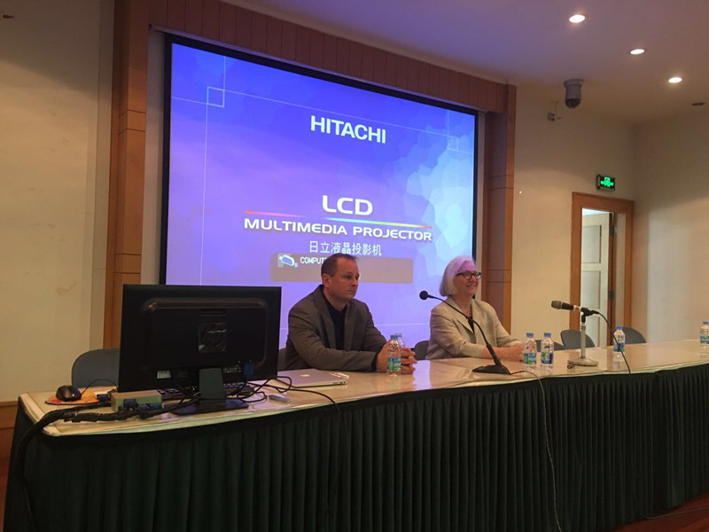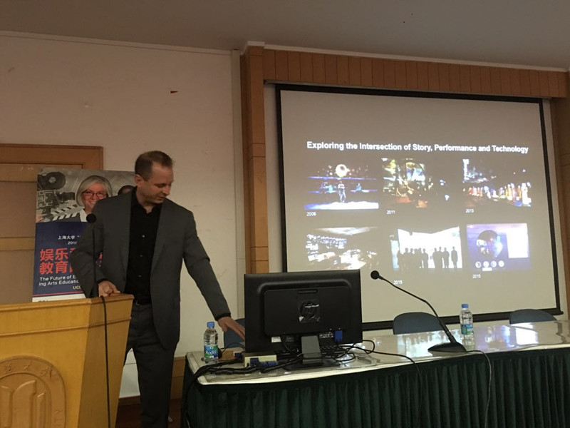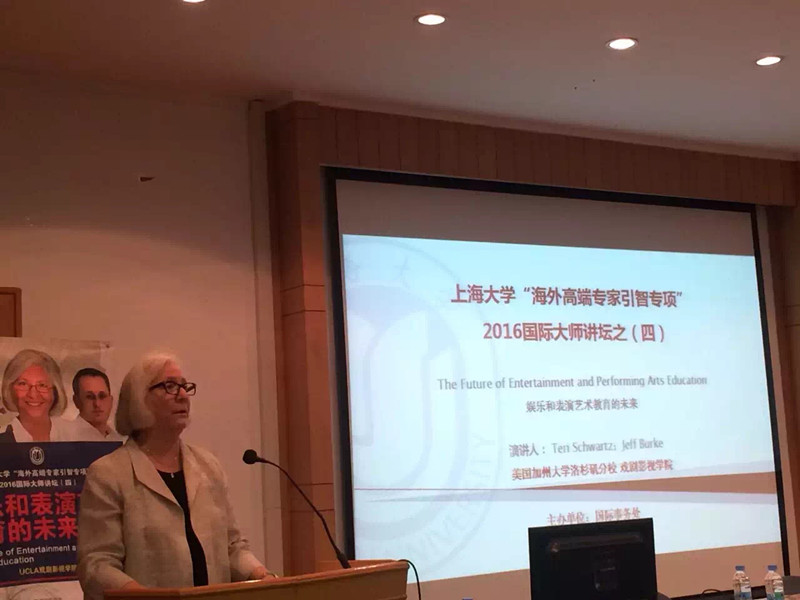 4月22日下午2点,上海大学“海外高端专家引智专项”2016国际大师讲坛之(四)于校本部J楼103室成功举行。来自世界顶尖的加州大学洛杉矶分校(UCLA)戏剧影视学院(TFT)院长Teri Schwartz教授及助理院长Jeff Burke教授作了题为“娱乐和表演艺术教育的未来”的精彩学术报告。演讲由上海电影学院副院长丁友东教授主持,来自上海电影学院、上海温哥华电影学院数百名学生出席了本次学术讲座。