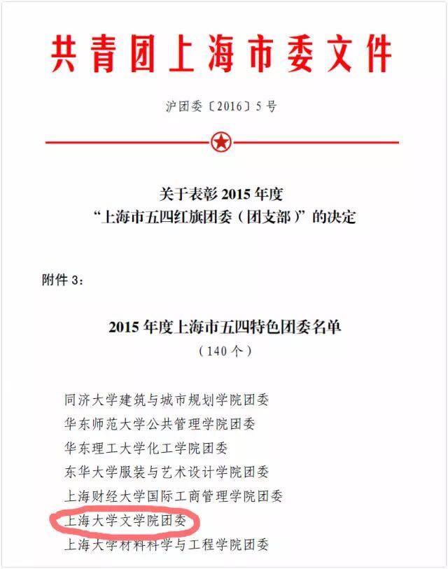 由团市委主办的2015年度上海市五四特色团委创建单位评选活动结束,上海大学文学院团委荣获“上海市五四特色团委”称号。