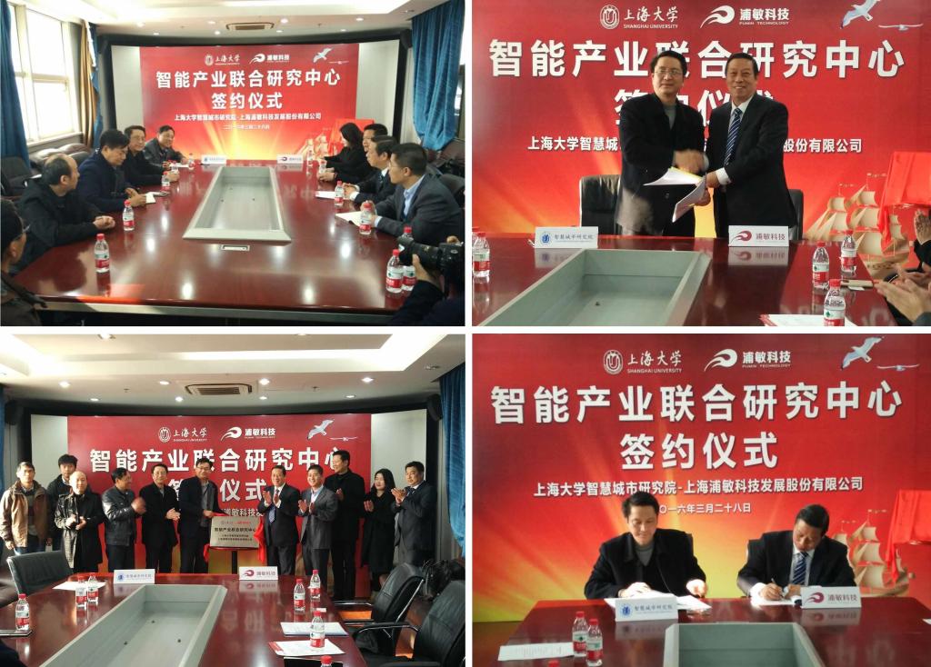 2016年3月28日下午4点,在上海大学智慧城市研究院举行了上海大学智慧城市研究院和上海浦敏科技有限公司联合成立的“智能产业联合研究中心”签约与揭牌仪式。仪式由智慧城市研究院的朱秋煜教授主持。参加仪式的上海大学人员有科技发展研究院副院长兼总支书记甄强教授、智慧城市研究院院长万旺根教授以及智慧城市研究院的老师和博硕士生,浦敏科技参加人员有董事长陆解民、总经理陆国平及其他公司主要成员。