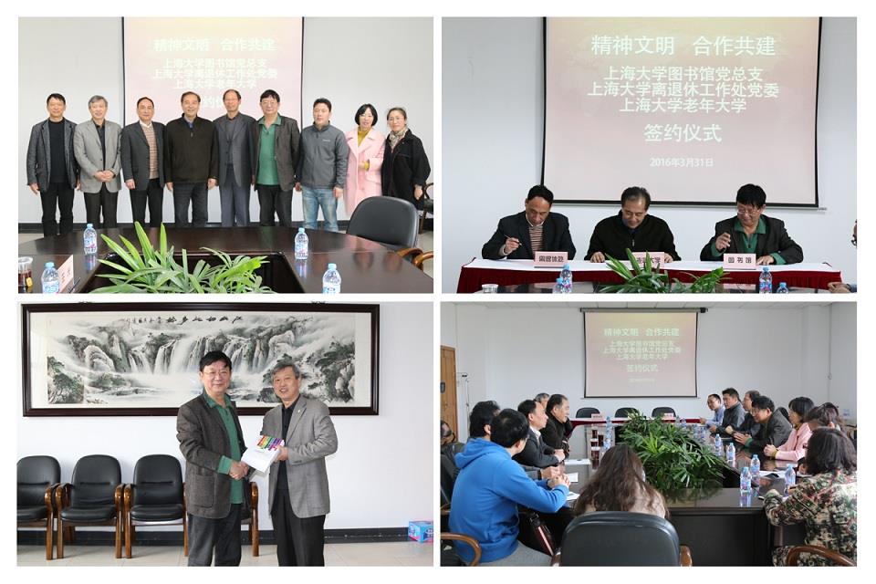3月31日下午,上海大学图书馆党总支与上海大学老年大学、上海大学离退休工作处党委精神文明合作共建会议及签约仪式,在校本部图书馆三楼会议室隆重举行,校精神文明办主任刘绍学,老年大学校长忻平、副校长姜继平、王光,离退休工作处常务副处长余志龙,图书馆直属党总支书记刘日宇、常务副馆长陆铭、副馆长刘华、卢志国、党总支副书记张庆兰以及图书馆部分党支部书记、部门负责人等出席会议,图书馆党总支副书记张庆兰同志主持本次会议及签约仪式。