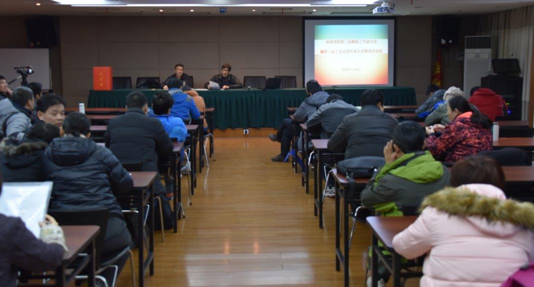 1月8日,体育学院三届四次教代会在校本部体育馆新闻中心召开。学院领导班子、中层干部以及全体教代会代表、列席代表参加了会议。会议由直属党总支副书记孙小明主持。会议听取并审议了分工会宗志伟主席的《2015年工会工作报告和经费使用说明》,宗主席在报告中对学院分工会2015年工作进行了全面回顾和总结。他指出,一年以来,在校工会的正确领导下,在学院党政班子和全体教职工的大力支持和配合下,围绕学校工作重点和构建和谐校园的目标,加强民主管理,加强师德教育,加强工会自身建设,认真履行工会的基本职能,为学院各项工作的全面有序开展提供了强有力的保障。
