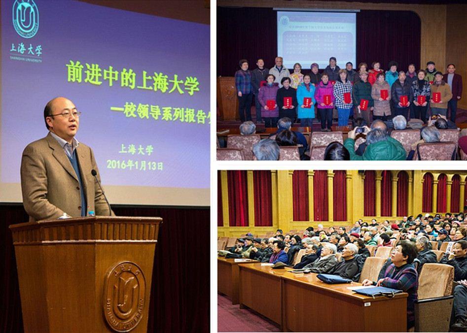 1月13日上午,2016年校领导系列报告会暨上海大学离退休系统先进个人表彰会在延长校区三教五楼演讲厅顺利举行。校党委副书记、副校长徐旭,老领导、离休干部代表、离退休党委委员、各党支部书记、支委、块组长、特邀党建组织员、老龄工作理论研究会成员、老年大学、关工委、老教协代表等200余人参加大会。会议由离退休工作处领导陆群英、余志龙主持。