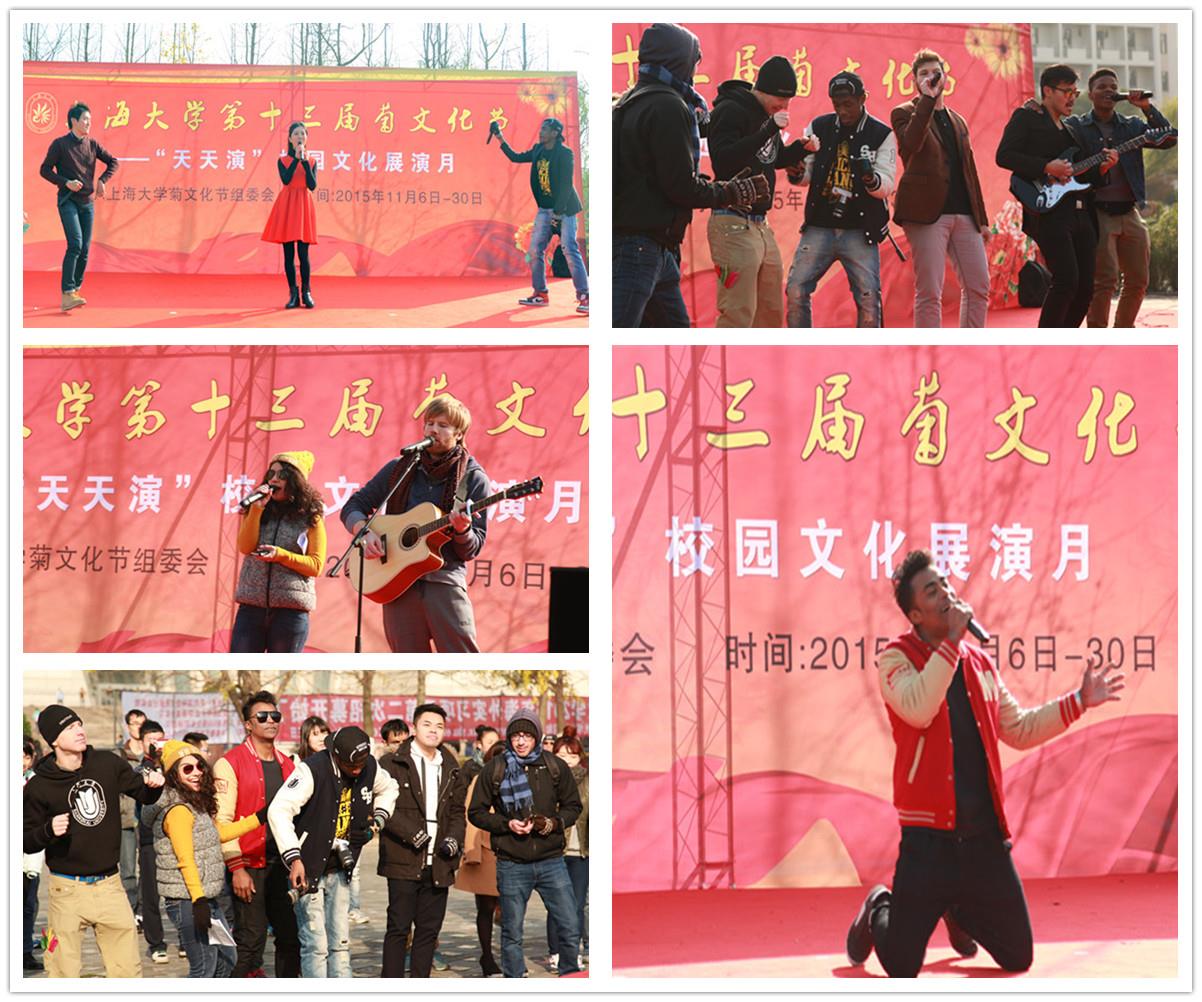 11月26日中午,上海大学第十三届菊文化节——“天天演”校园文化展演月国际交流学院专场演出在宝山校区下沉式广场进行。来自国际交流学院的留学生同学不畏严寒,为大家带来了精彩的歌曲、舞蹈等文艺节目,也为冬日的上大增添了一份暖意。