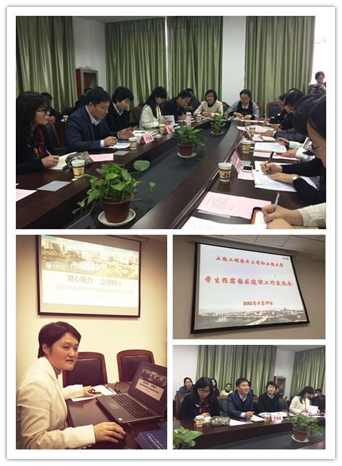 陈伟平首先对上海工程技术大学的来访表示热列的欢迎,并介绍了上海大学生活园区的整体情况。学工办副主任吴蔚介绍了上海大学辅导员队伍发展的整体情况,社区学院党委副书记、社区管理部副主任孙玉华介绍了社区学院辅导员的工作,接着学生社区文化建设主管褚凤灵、信息主管王雅萍分别就上海大学生活园区文化建设和信息化工作做了详细的介绍。上海工程技术大学学生工作部副部长严运楼将上海工程技术大学的相关情况做了详细的交流。