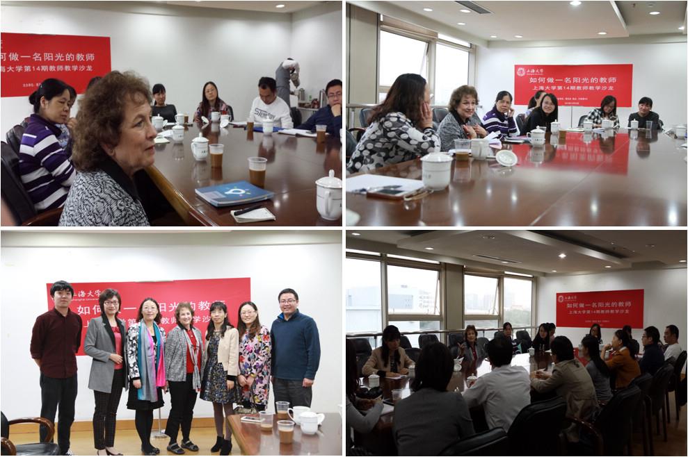 10月28日下午,我校举办第14期教师教学沙龙。美国心理学专家Caroles.light博士来我校与部分青年教师就“如何做一名阳光的教师”主题展开热烈互动。沙龙由教务处副处长顾晓英主持,来自心理辅导中心、悉尼工商学院、国交学院、影视学院、文学院等院系的20余名教师参与。