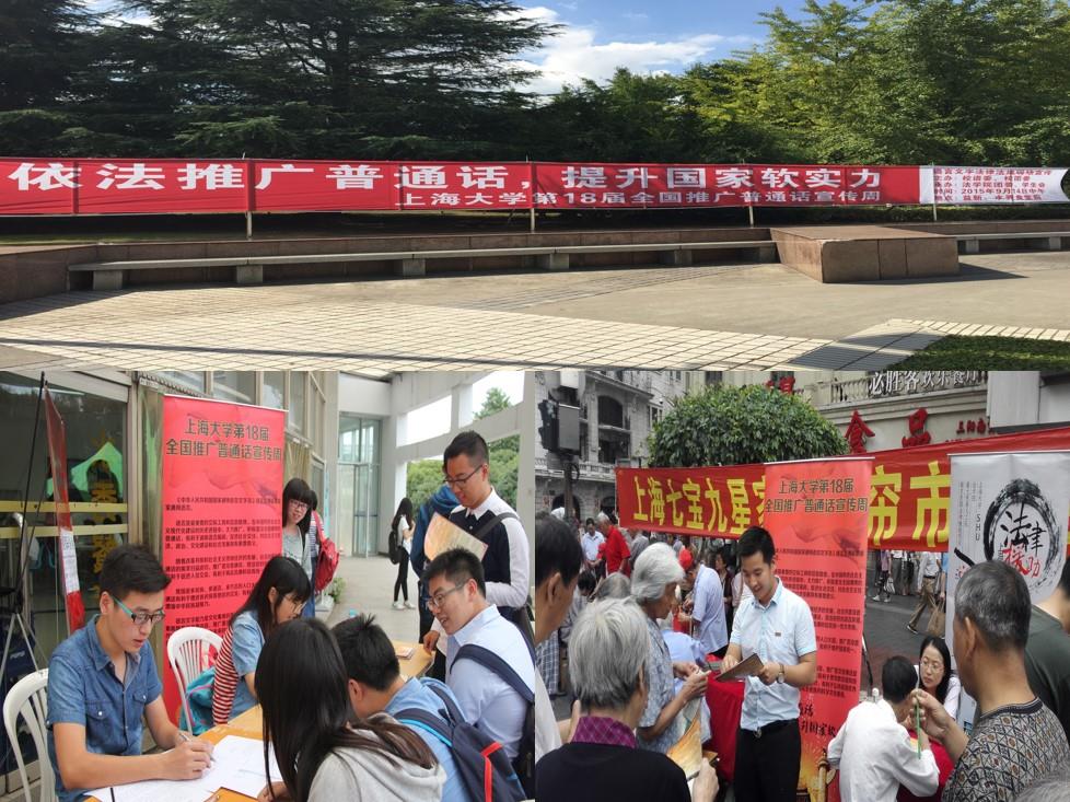 2015年9月14日—9月20日,是上海大学第18届推广普通话宣传周,图书馆前广场印有本次活动主题“依法推广普通话,提升国家软实力”的横幅格外醒目。9月14日中午,由校语委、校团委主办,法学院团委、学生会承办的语言文字法律法规宣传活动在校本部水秀、益新食堂门前分别举行,活动的目的是向广大师生宣传普通话的重要性和我国的语言文字法律法规。