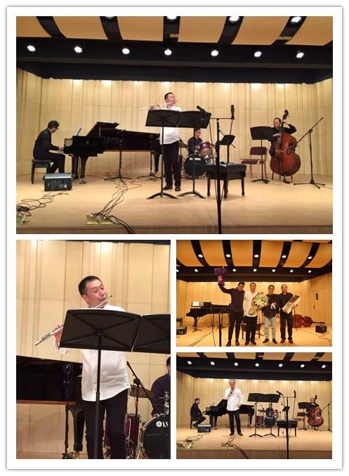 音乐会上,台上的四位演奏家为我们先后带来了由著名法国作曲家克劳·博林(Claude Bolling)创作的著名作品《长笛和爵士钢琴三重奏组曲》的部分曲目。通过艺术家们的精湛演出技艺,将爵士乐和古典音乐巧妙融合,在完美诠释作曲家音乐风格的同时,也带给现场观众完全不同以往的音乐体验。穿插于演奏之间,赵晓峰老师还为同学们详细的介绍了爵士乐、以及爵士乐在中国的发展。耐心地讲解以及对作品的完美演绎连连引来台下观众的欢呼和掌声。