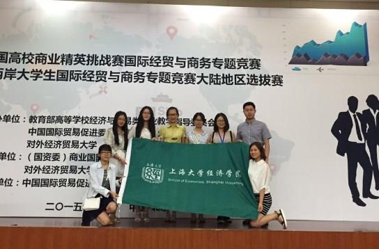 为促海峡两岸高等院校经贸教育的专业交流与合作,提升海峡两岸大学生国际经贸与商务专业知识综合运用水平和应用学术研究能力,由教育部高等学校经济与贸易类专业教学指导委员会、中国国际贸易促进委员会商业行业分会(以下简称“商业贸促会”)和对外经济贸易大学经共同主办的2015年全国高校商业精英挑战赛国际经贸与商务专题竞赛,8月22-24日在北京对外经济贸易大学举办,上海大学经济学院两支参赛队分获二、三等奖佳绩。 本次比赛正值放假期间,比赛初便得到了院系领导和各系老师的大力支持,老师和同学在暑期中通过线上、线下的多次沟通和交流,最后我院两支参赛队伍的作品进入决赛。决赛在北京对外经济贸易大学举办,临行前,学院还专门在567会议室进行了预答辩,学院党委副书记贺利、指导老师倪中新老师和王红老师、学院团委书记郁丽洁,分别从答辩内容、问题准备、PPT的结构、演讲技巧等各方面,对于两支参赛队伍都给予了充分的建议和意见。
