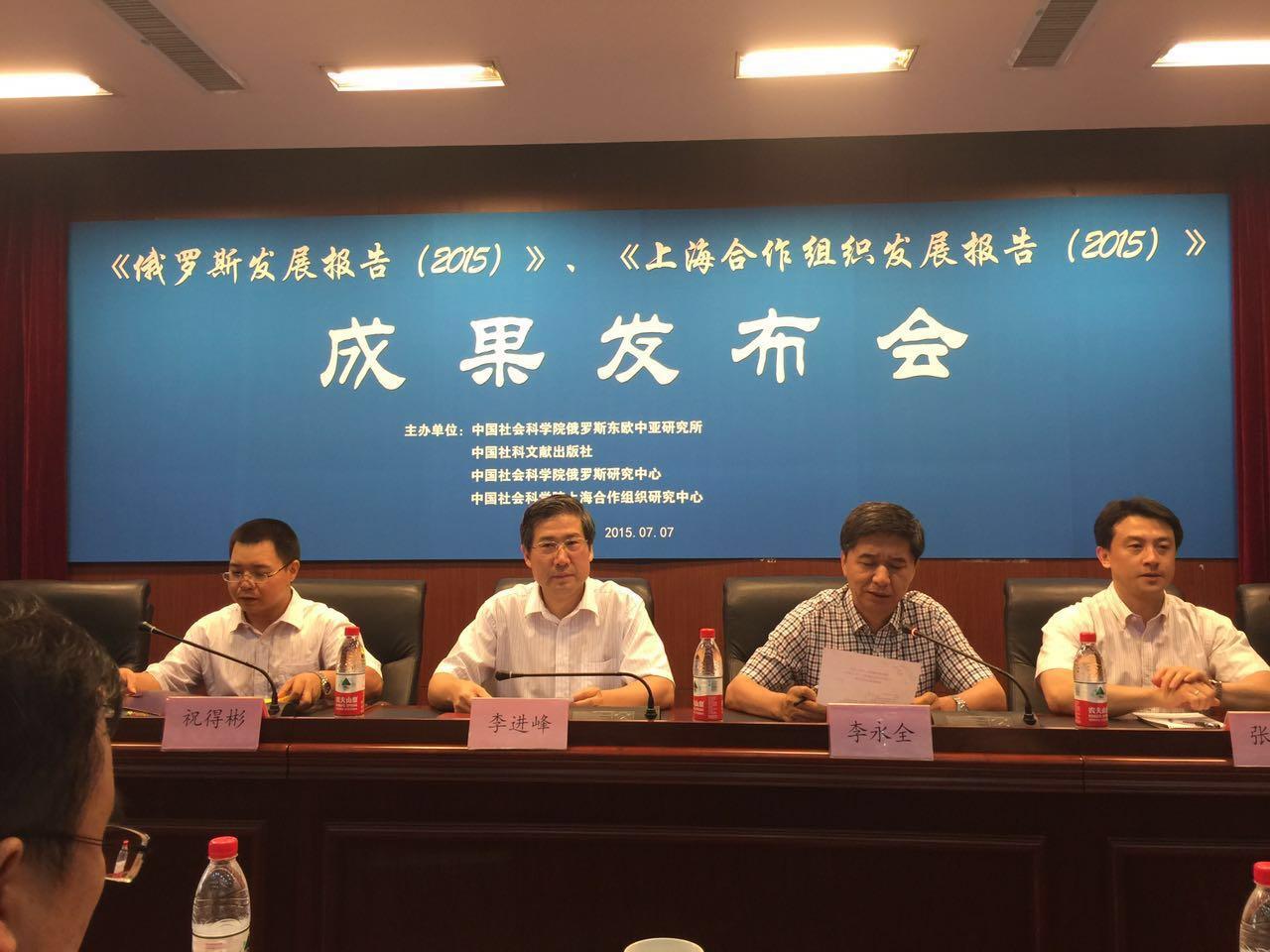 7月7日,中国社会科学院俄罗斯东欧中亚研究所、上海大学上海合作组织公共外交研究院及社会科学文献出版社共同在京举办了上海合作组织黄皮书《上海合作组织发展报告(2015)》的新闻发布会。发布会围绕上合组织面临的国际和地区形势、复杂的地缘政治经济格局变化进行了深入剖析,并就国际地区热点问题和重大事件对组织发展的影响,进行了细致探讨。发布会由中国社会科学院俄罗斯东欧中亚研究所所长李永全主持。中国社会科学院俄罗斯东欧中亚研究所党委书记李进峰、上海大学上海合作组织公共外交研究院副院长张恒龙等众多专家学者出席发布会。