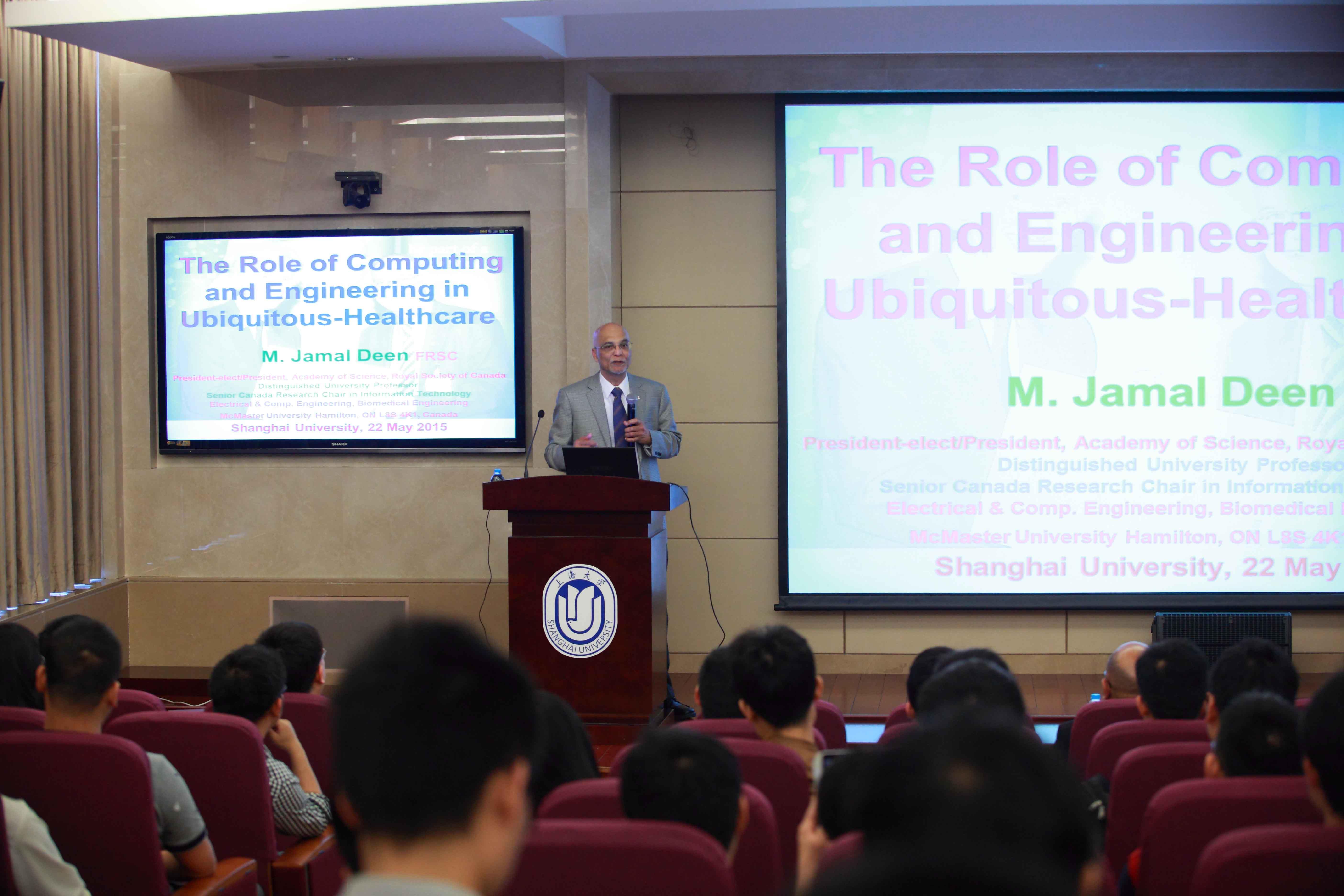 5月22日上午10:00,我校2015国际大师讲坛之(六)正式开讲。此次演讲的题目是:The Role of Computing and Engineering in U‐Healthcare 无处不在的健康关怀(U-Healthcare)中计算机和工程技术的作用。演讲人是加拿大皇家科学院院长(2015-2017)、麦克马斯特大学杰出教授Mohamed Jamal Deen 院士。演讲前,上海大学党委书记、校长罗宏杰教授在乐乎新楼上善厅会见了加拿大麦克马斯特大学的Mohamed Jamal Deen院士和Ridha Khedri教授,聘请Mohamed Jamal Deen院士为上海大学名誉教授,并同时聘请Ridha Khedri教授为上海大学兼职教授,聘任仪式后,双方进行了诚挚友好的交流互动。