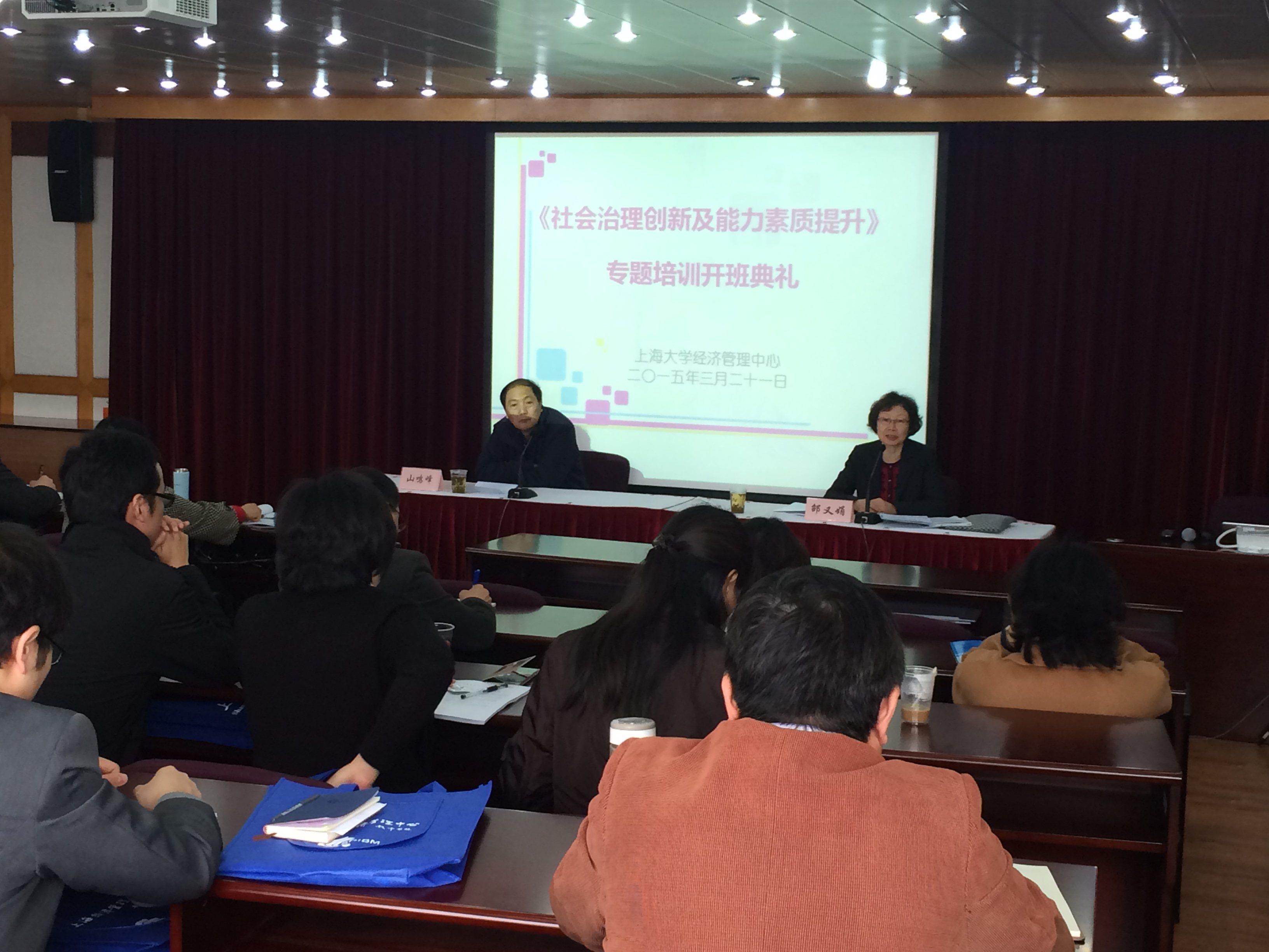 经过前期数月的紧张筹备,2015年3月21日上午9时,由上海大学经管中心主办的2015年上海市卫生计生系统《社会治理创新与能力素质提升》专题研修班在我校延长校区科技楼806室开班。上海市卫生与计划生育委员会领导副局级巡视员邵又娟首先在开班仪式上作动员。开班仪式由上海大学经管中心主任山鸣峰主持,来自上海市各区县的计生委主任、副主任等近50名学员参加了此次学习活动。