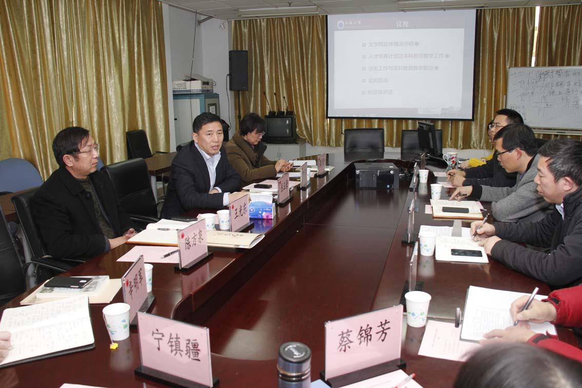 竺剑书记对丛校长一行来学院指导工作表示衷心感谢,常务副院长张勇安教授就文学院的历史沿革、学科建设、师资队伍、科学研究、人才培养等方面的情况等做了系统的介绍,同时提出坚持“以学科建设为核心,以科学研究为底蕴,以国际化为依托,以通专兼备的创新型人才培养为目标”的育人理念。表示文学院不但要培养出高质量的通专之才,还要承担起全校学生的人文知识、人文素养养成教育的重任。曾军副院长则从通识课与大类通识课的关系、学院“后三年”培养框架、课内外联动及特色项目五个方面就本科人才培养情况进行了汇报,并表示文学院愿意在人才培养和本科教改上先行先试。院学工办崔海霞主任也就学生工作和教学之间如何紧密配合、协同合作和就业问题作了详细介绍。