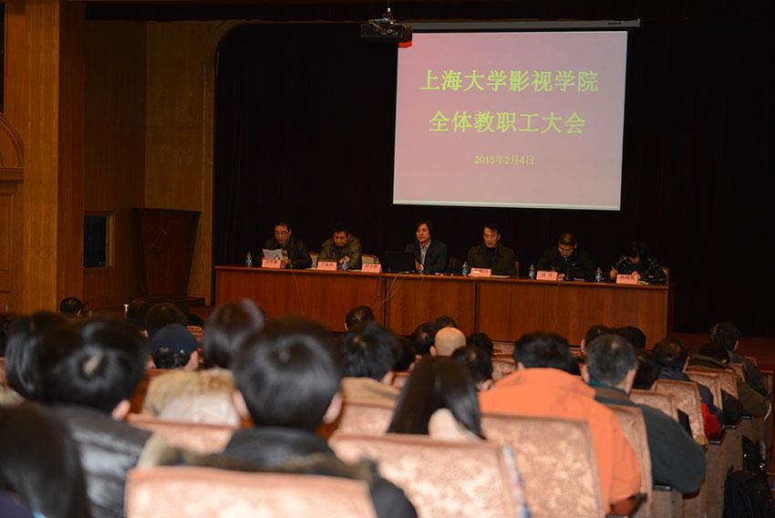 2月4日上午8:30,上海大学影视学院2015年第一次全体教职工大会在延长校区三教5楼会议厅召开。影视学院党委书记王晴川,影视学院常务副院长何小青,文科处常务副处长、影视学院副院长聂伟,副院长丁友东,学生工作负责人孙琦琰,工会主席方烈敏,以及影视学院全体教职工出席会议。会议还特邀延长校区建设指挥部副总指挥、党组书记欧阳华,延长校区建设指挥部平台建设总负责人张文俊,上海温哥华电影学院常务副院长刘海波等同志参加。会议由上海大学文科处常务副处长、学院副院长聂伟同志主持。