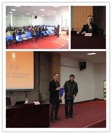 王老师首先向大家介绍了美术学院的基本概况,包括学院架构、办学特色、学院地位等。随后,王老师从学生构成、性格特点等方面,重点介绍了美术学院学生的基本情况,他从学生的日常生活入手,站在园区住宿管理的角度,引用鲜活的实例介绍了美术专业学生的各方面特点。王老师生动的讲解和幽默的语言,博得了现场所有管理员老师们的阵阵掌声。讲座最后,社区管理部副主任陈伟平老师代表社区,向王岭山老师颁发了锦旗,以示感谢。