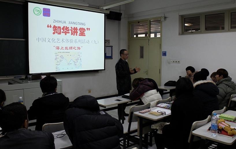 1月8日下午,上海大学孔子学院奖学金中国文化艺术体验系列活动——“知华讲堂”第九讲“海上丝绸之路”在D208教室举行。毕业于复旦大学中文系、现任《上海大学学报(社会科学版)》编辑部主任的李孝弟博士作就“海上丝绸之路”的历史、演变和发展做专题报告,并与来自各国的留学生交流互动。本期“知华讲堂”由杨静副院长主持。