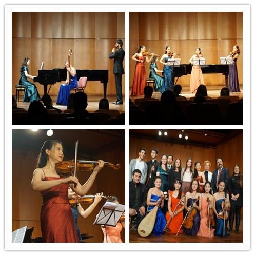 在海峡大学孔子学院中方院长刘义副教授精彩而简短的开场白后,音乐会由上海大学音乐学院师生组成的弦乐重奏组合演奏的《勃兰登堡协奏曲》开场,富有色彩而轻快地旋律很快调动了现场观众的热情。之后,来自音乐学院的大四学生邱品榕和朱莹琳演奏了巴赫的《双小提琴协奏曲》,两位小提琴手交替演奏的旋律新鲜而具有趣味,深刻体现了巴洛克音乐装饰性的音乐风格,博得了台下观众的阵阵掌声。两位小提琴手演毕,音乐会进入了中国音乐时段。大二学生吴思里同学演奏的竹笛曲《牧民新歌》旋律浓郁清新,展现了中国民间特有的音乐性。大四学生罗楠演绎的二胡名曲《赛马》体现了二胡这件乐器特有的旋律性及其复杂的演奏技巧,把草原上骏马奔腾的景象还原得栩栩如生。由大二学生夏烨和吴思里组成的琵琶与竹笛组合,演绎了新疆名曲《送我一支玫瑰花》,其音乐风格与土耳其民间音乐颇有几分相似之处,其速度与音色展现了两国相近的音乐特点,引起了在场土耳其观众的共鸣。接着,音乐学院副教授任音老师与以上两位同学合作演奏了钢琴曲《彩云追月》,乐曲应答式的对话仿佛是云月的嬉戏,情态逼真、意趣盎然。这些同学和老师把中国音乐的特点演绎得十分到位,用中国民族器乐曲较好地诠释了中国音乐的内涵和特点,让土耳其观众走进中国音乐,加深了对中国音乐的认识和了解。