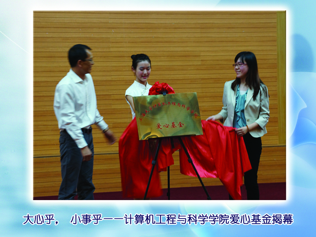 2014年5月28日晚18:30,上海大学第五届慈善文化节晚会在宝山校区图书馆报告厅顺利举行。计算机工程与科学学院爱心基金也借这一时机正式揭幕了!在上海大学20周年校庆之际,计算机学院爱心基金的成立标志着计算机学院师生积极奋进,继续践行着自己的诺言:辉煌计算机、自强永不息。