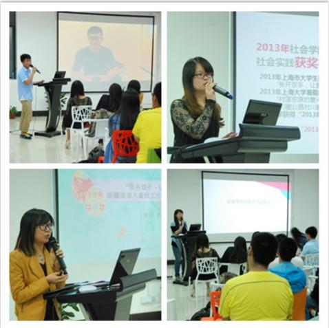 5月12日晚上9时,社会学院2014年暑假社会实践启动仪式在上海大学南区306教室举行。社会学院团委书记韦淑珍、团委副书记刘璐、姚烨林来到现场,11级本科生曹诗婕、夏兆强、叶夏君、缪腾腾也作为分享嘉宾参与本次启动仪式。本次启动仪式由院团委实践部部长史雅丽主持。