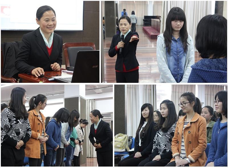 万老师的开场别具匠心,她通过播放日常生活中的视频,让大家观察细节,引出对于礼仪的全新认识:礼仪不仅仅是礼节,更是为他人着想。接下来,介绍了礼仪的常识,特别介绍了接待礼仪中的会议礼仪、用餐礼仪、乘车礼仪、着装礼仪等。此次培训的中心环节是微笑、坐姿、站姿、蹲姿、走姿、握手和倒茶等形体训练。万老师一边讲解,一边以自己到位且优雅的姿势一一示范,并让全体同学对着镜子、墙壁或者互相观察现场尝试,对姿势不到位的同学加以调整。万老师以她出众的气质、谦和的话语牢牢吸引了在场所有学员的注意力。她说:美丽并不只是在于外表和装扮,也在于处事和礼仪,我们的一言一行都应以为他人着想为目标,在一点一滴的不断积累中养成关怀谦和的完美气质。